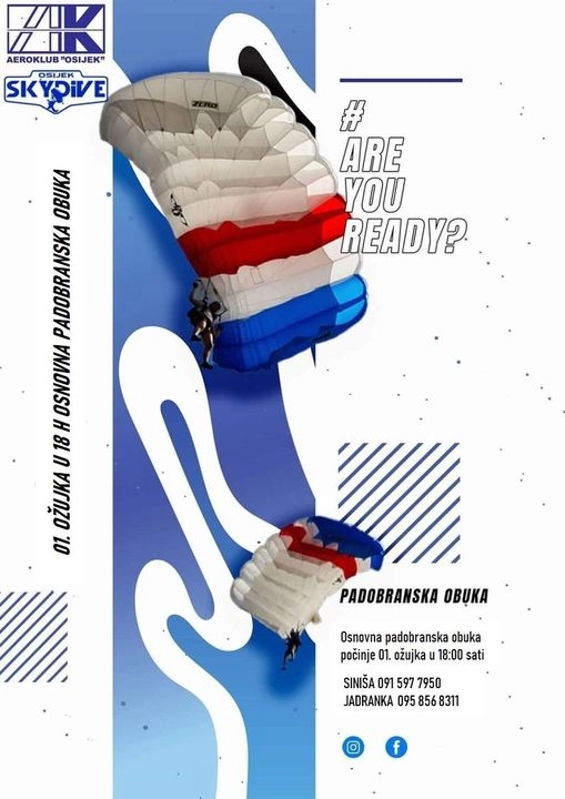 I ove godine Aeorklub "Osijek" organizira osnovnu padobransku obuku, u ožujku 2024. godine. Obuka započinje 1. ožujka u 18 sati, a za više informacija trebate se javiti u Aeoroklub Osijek (brojevi telefona se nalaze na letku dolje).