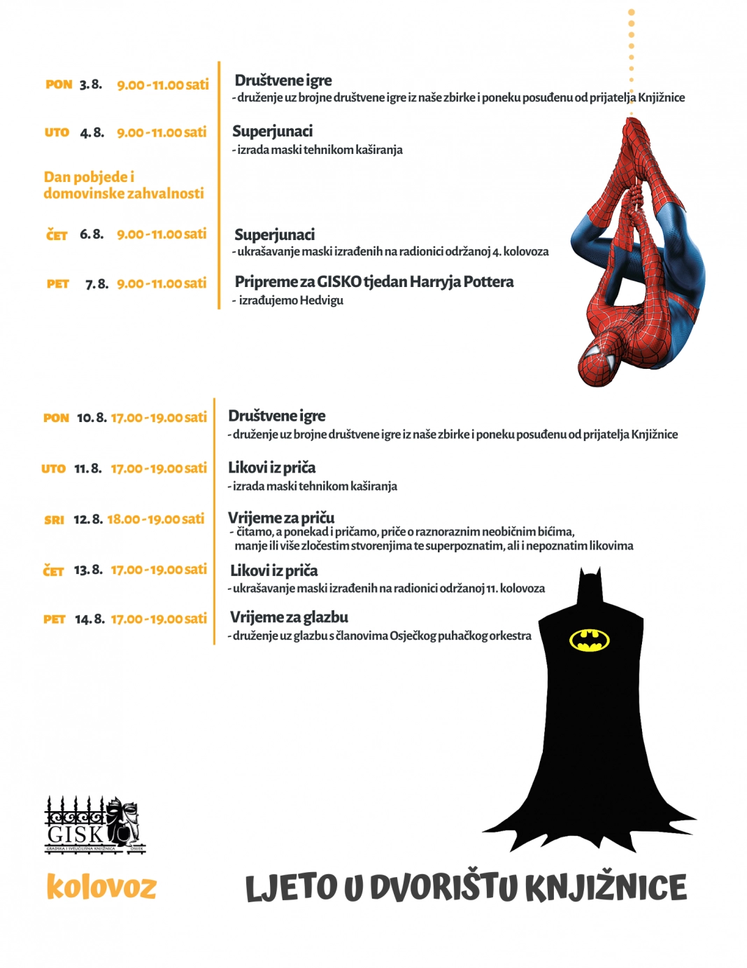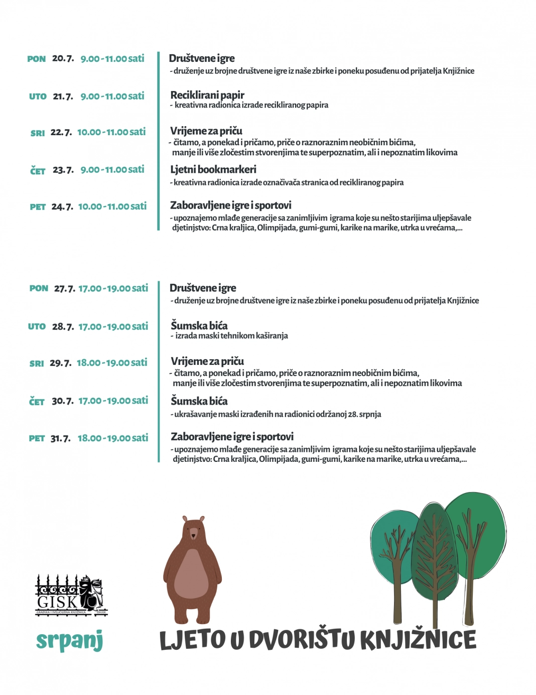 Detaljan raspored svih aktivnosti organiziranih u sklopu Ljeta u dvorištu Knjižnice nalazi se u nastavku;