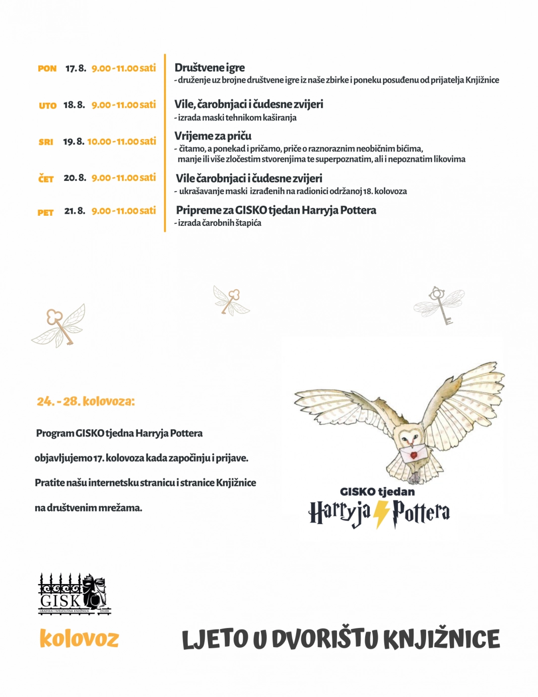 U razdoblju od 6. srpnja do 22. kolovoza 2020. godine u dvorištu Gradske i sveučilišne knjižnice Osijek provodit će se program Ljeto u dvorištu Knjižnice, koji obuhvaća više od trideset radionica, a uključuje nezaobilazno Vrijeme za priču, Vrijeme za glazbu, Zaboravljene igre i sportove, niz kreativnih radionica, pretežno ekološkog karaktera te Pripreme za GISKO tjedan Harryja Pottera kao uvod u završni tjedan ljetnog programa Knjižnice kada harrypotterovci imaju priliku za posljednje opuštanje prije povratka uobičajenim školskim obvezama.