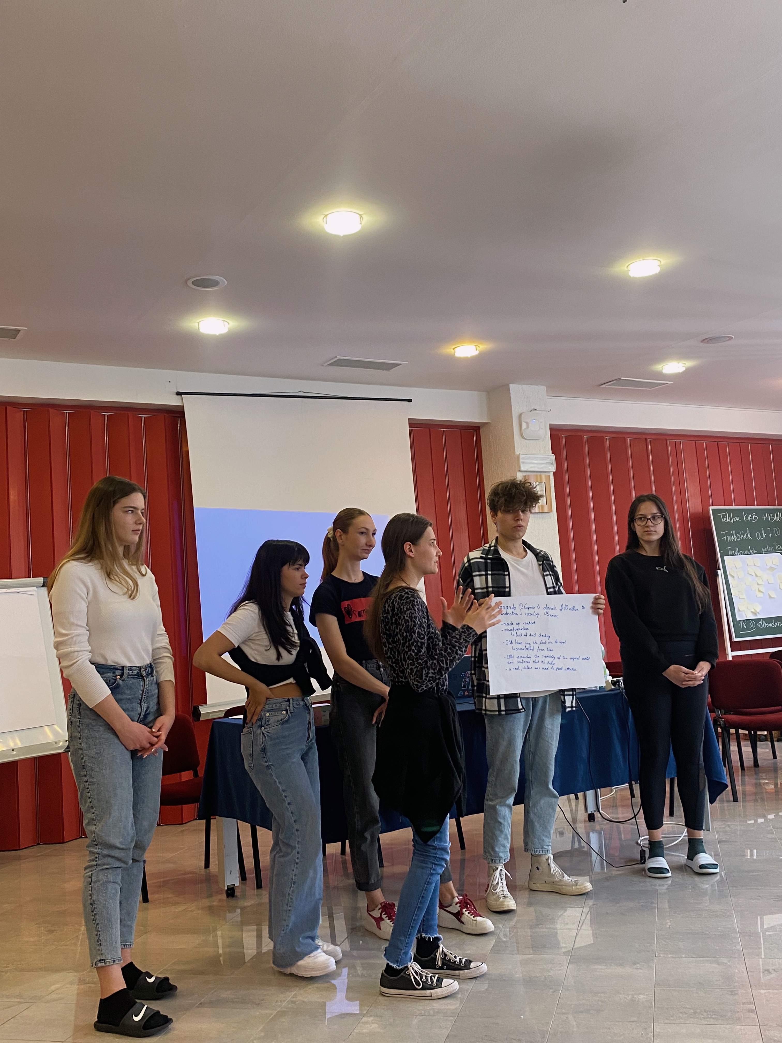 Nakon toga, tri dana smo učili o medijima kroz brojne radionice. Teme koje smo obradili su vrijednosti vijesti, senzacionalizam i lažne vijesti, društvene mreže, influenceri, emocije u medijima i reklame. Radionice su uglavnom bile timske te smo imali priliku upoznati se i surađivati s brojnim drugim sudionicima jer su se timovi često izmjenjivali. Nakon toga, dva dana smo pripremali kratki film na temu lažnih vijesti kao završni projekt te smo naučili snimati i uređivati kadrove na mobitelu. Posljednji dan smo gledali naše uratke, imali finalnu evaluaciju programa i dogovorili diseminaciju rezultata.