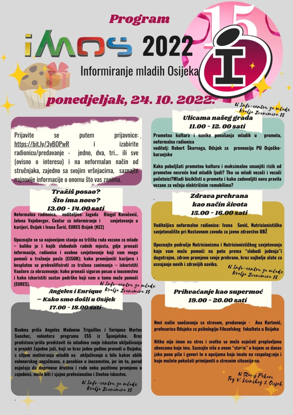Kako je ovaj dan i 15. rođendan Regionalnog info-centra za mlade Osijek, pripremili smo šarolik program, a sve sa željom kako bismo vas MLADE potaknuli da krenete i sami tražiti INFORMACIJE koje vas mogu odvesti u različite aktivnosti i potaknuti neke pozitivne promjene u vašem životu.