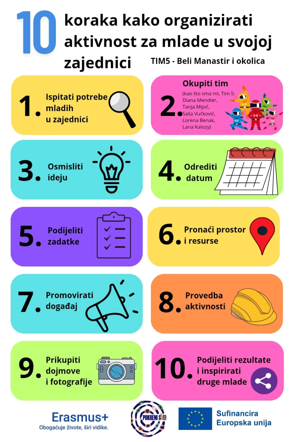 U nastavku pogledajte video aktivnosti i vizual “10 koraka kako organizirati aktivnost za mlade u Belom Manastiru i okolici”.