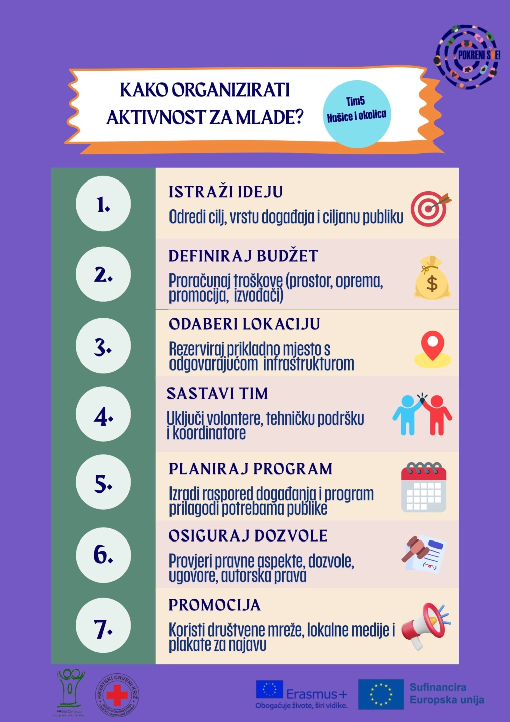 U nastavku pogledajte video aktivnosti i vizual “Kako organizirati aktivnost za mlade”, koje su napravili sami mladi, članovi Tima5 za Našice i okolicu. A pored ovog online predstavljanja podijelit će svoje iskustvo s vršnjacima u školi i udruzi. Bit će to prilika za nove razgovore, nove ideje i možda – nove aktivnosti.