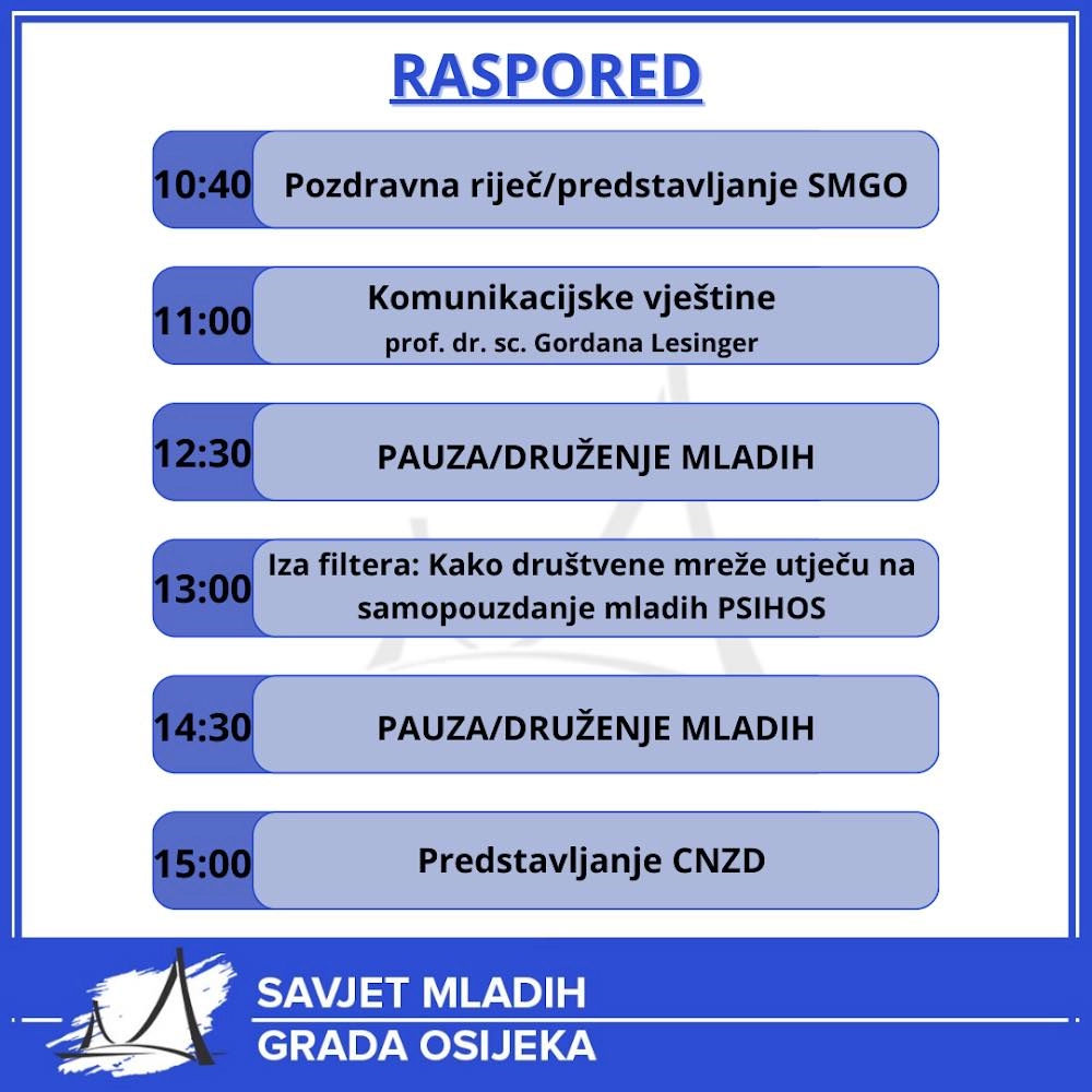 Savjet mladih Grada Osijeka ovim putem Vas poziva da se uključite u obilježavanje Dana mladih grada Osijeka, 8. prosinca u prostorijama Fakulteta agrobiotehničkih znanosti u Osijeku. Dan mladih bit će obilježen predavanjima: prof. dr. sc. Gordane Lesinger, Kluba studenata psihologije Filozofskog fakulteta u Osijeku zajedno s profesorima psihologije, a zadnje predavanje bit će predstavljanje Centra za nestalu i zlostavljanu djecu. U vrijeme pauza moći ćete se okrijepti uz prigodno piće i grickalice te se umrežiti s članovima Savjeta mladih kao i s ostalim mladima i gostima.
