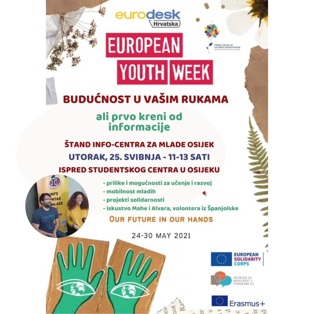 Zadovoljstvo nam je najaviti Europski tjedan mladih 2021. Od 24. do 30. svibnja u cijeloj Europi održavat će se razna zanimljiva i inspirativna događanja na temu „Naša budućnost u našim rukama”. Budućnost gradimo danas, a vi ste oni koji postavljaju ciljeve i mogu potaknuti pozitivne promjene.